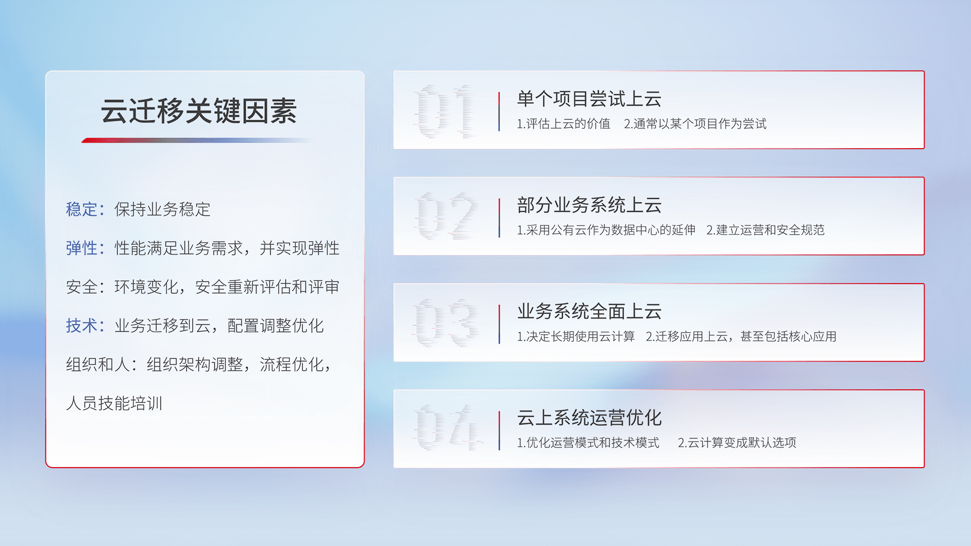 结合实际业务,,从规划设计、、、、云平台选型、、、、云原生改造、、、数据迁移、、、集成交付,,迁移全过程为客户识别最佳上云路径,,,,做好风险识别管理,,,设计网络架构、、、身份权限、、安全审计合规、、、操作审计、、、、日志审计、、、监控告警策略、、、多站点容灾设计等,,,,对云上基础设施进行整体规划,,提升IT治理水平,,以满足弹性、、、高可用、、高性能的需求。。。。