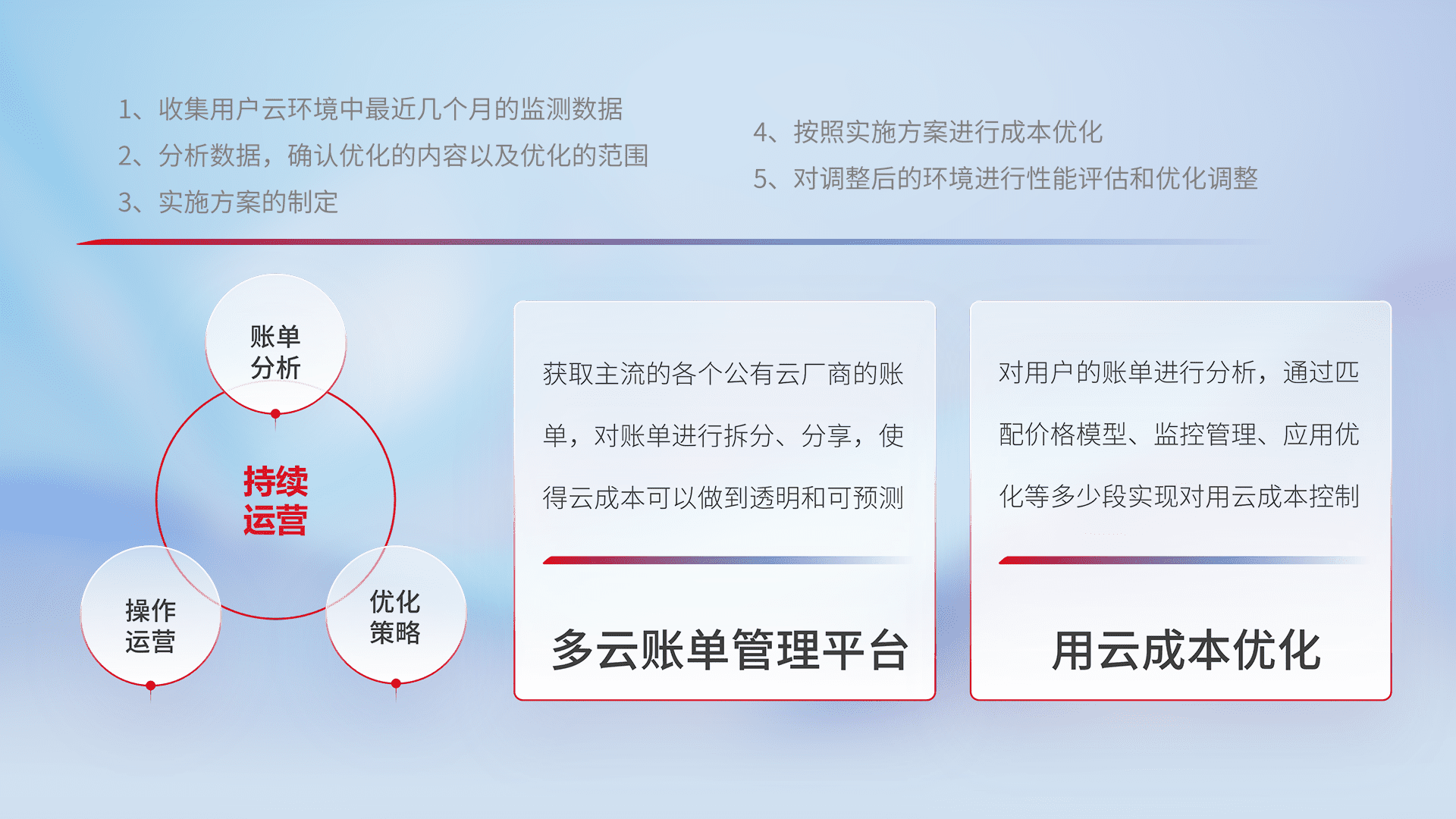 通过多云纳管,,以统一的资源数据模型把客户的云资源进行抽象和封装,,,进而实现对多云资源的统一操作,,,,保障云资源管理的可靠性、、稳定性与可用性。。量身定制化运维内容,,配置、、、开发运维、、、、补丁管理、、、、备份、、、、监控、、、、认证和访问管理、、、审计和日常巡检等,,保障在用云过程中的可靠度,,,稳定度以及高可用率。。