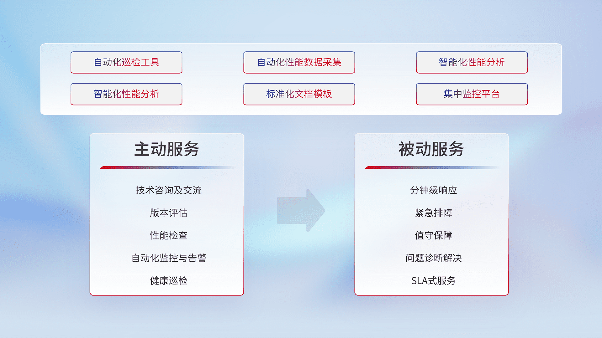 智能化工具和标准化文档,,,,保障服务质量,,,,提供主动服务(包含技术咨询、、、版本评估、、、性能检查、、自动化监控与告警、、、、健康巡检)和被动服务包含(分钟级响应、、紧急排障、、、值守保障、、、问题诊断解决、、SLA服务)。。。